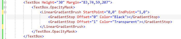 So, above code block sets the TextBox control OpacityMask with a LinerGradientBrush where gradient start from Black to Transparent.